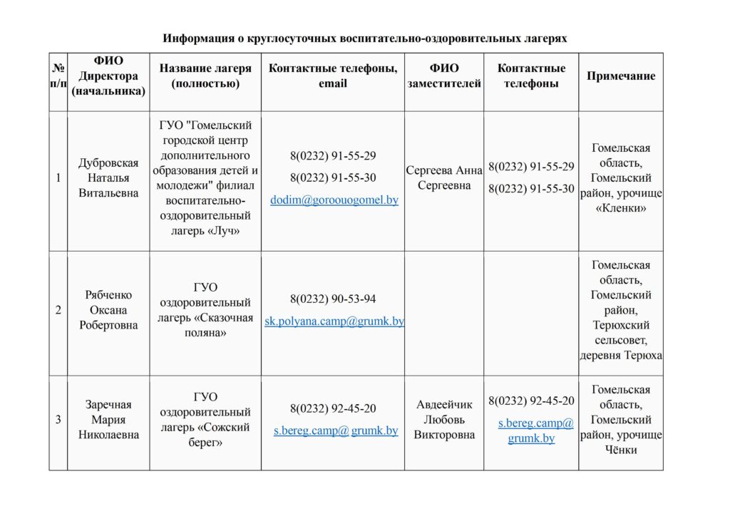 Информация о круглосуточных воспитательно-оздоровительных лагерях