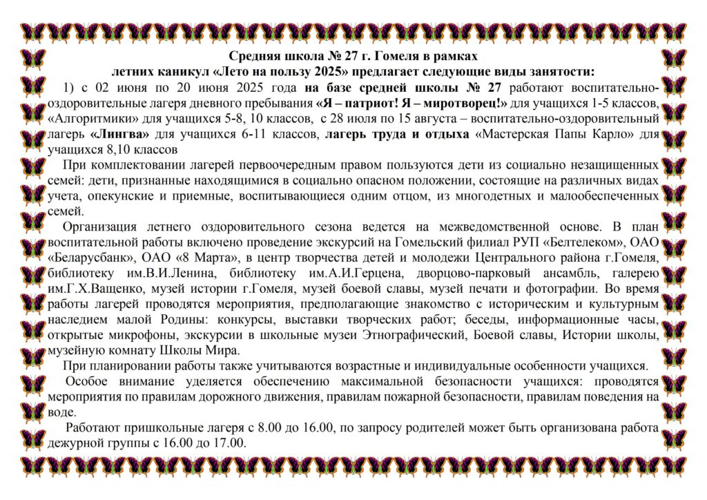 Средняя школа № 27 г. Гомеля в рамках летних каникул «Лето на пользу 2025» предлагает следующие виды занятости 13.05.202528.05.2025 Администратор