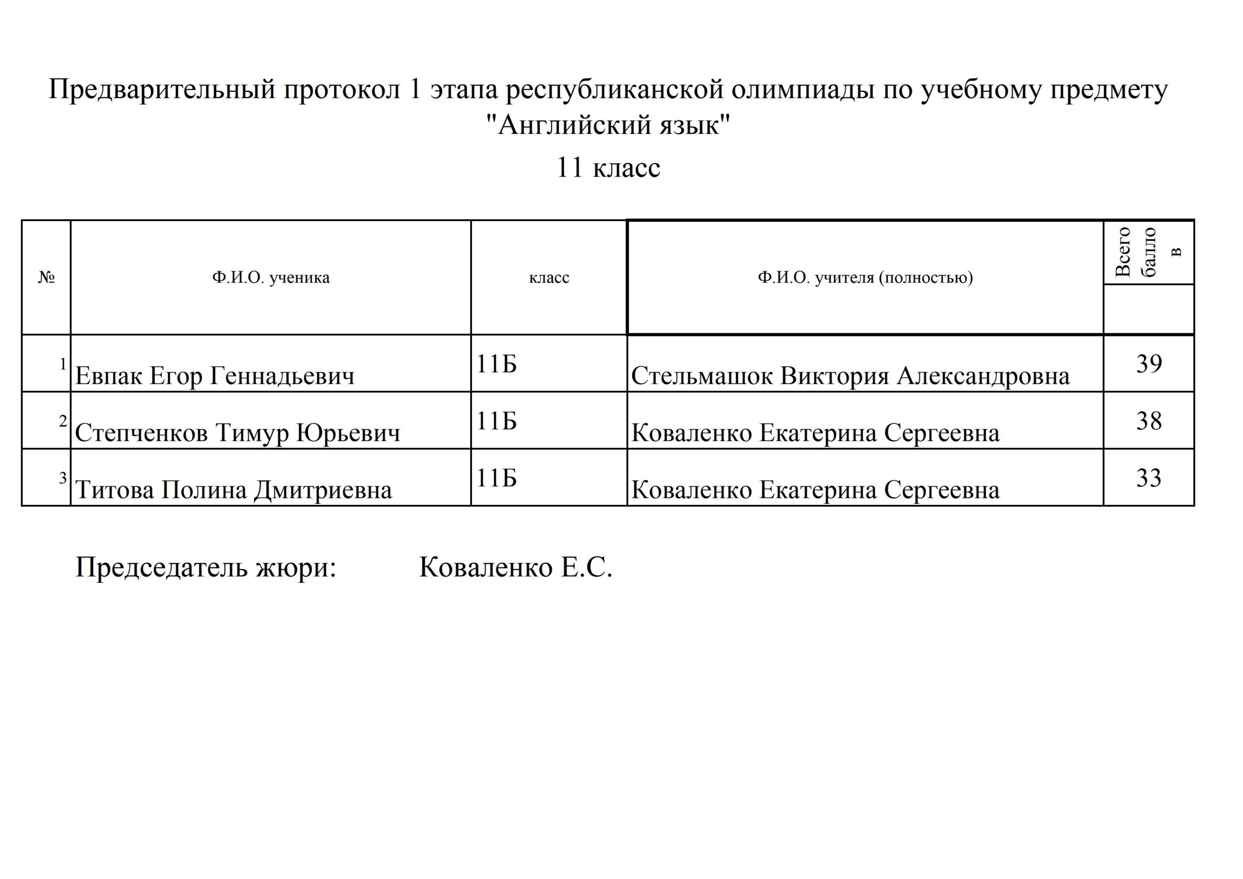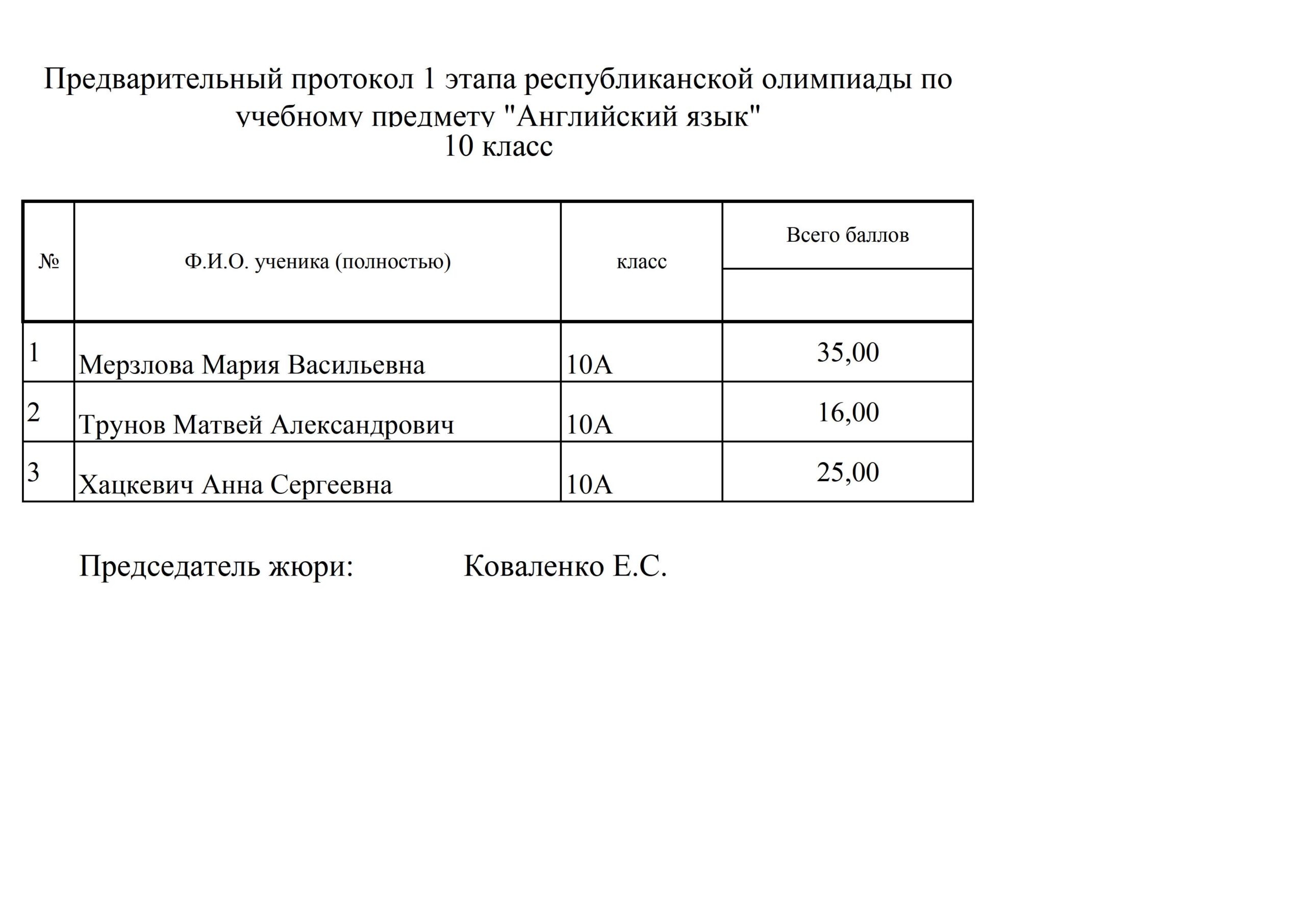 Предварительный протокол первого этапа республиканской олимпиады по учебному предмету Английский язык