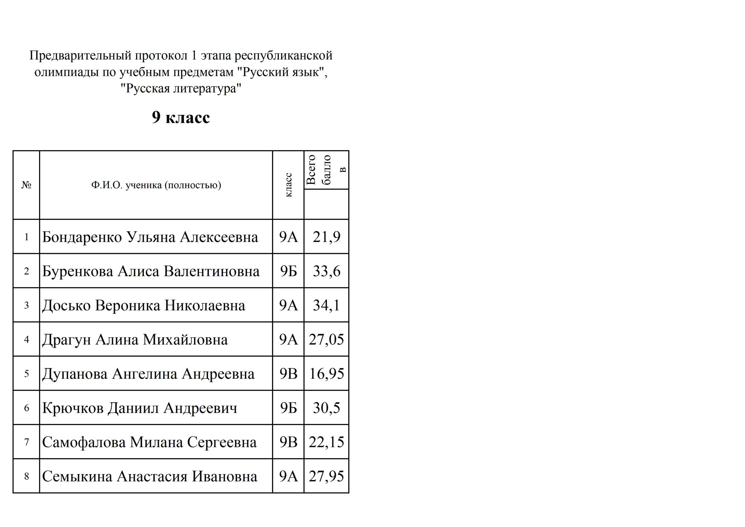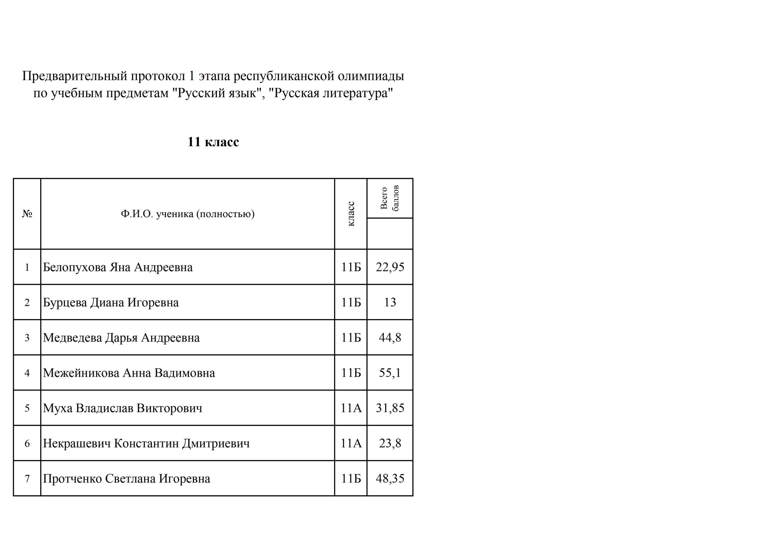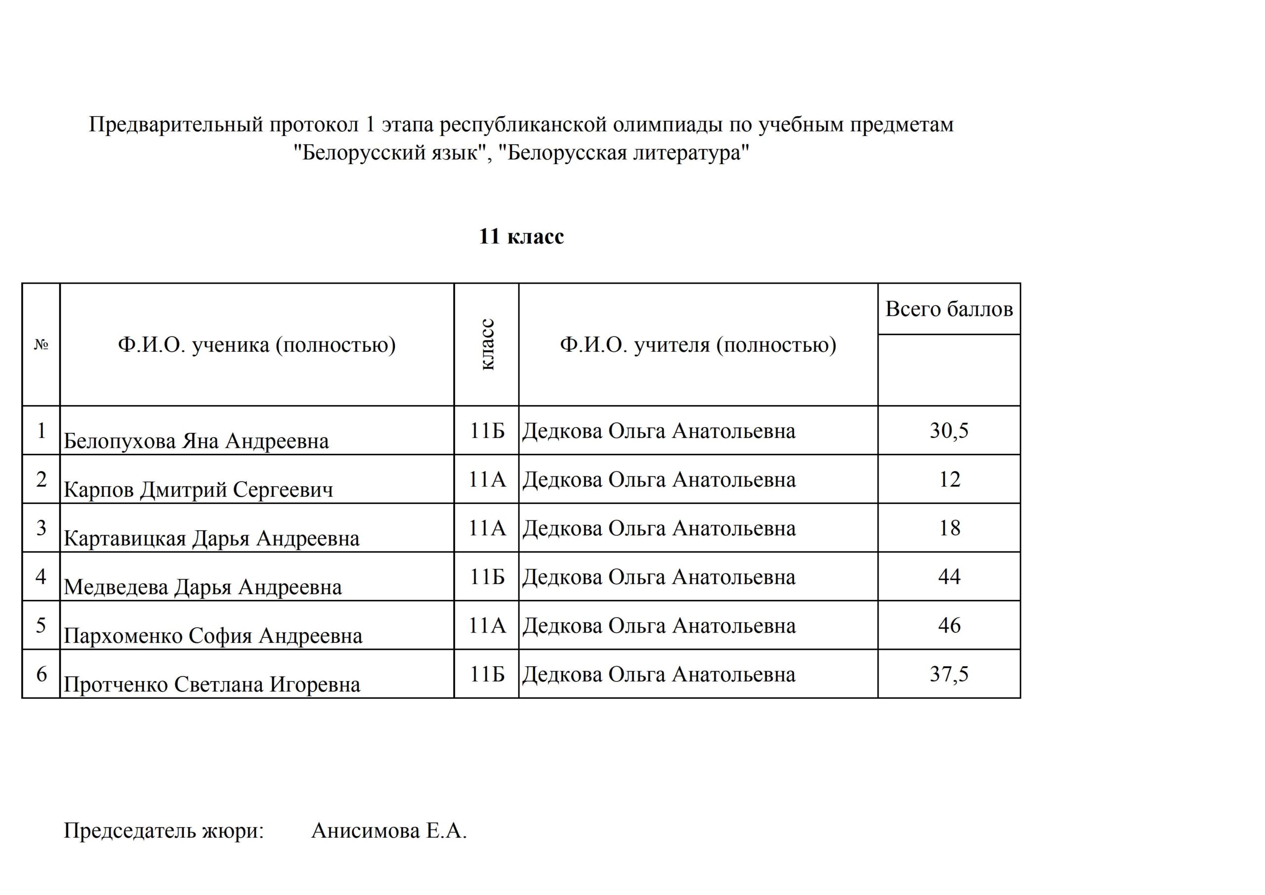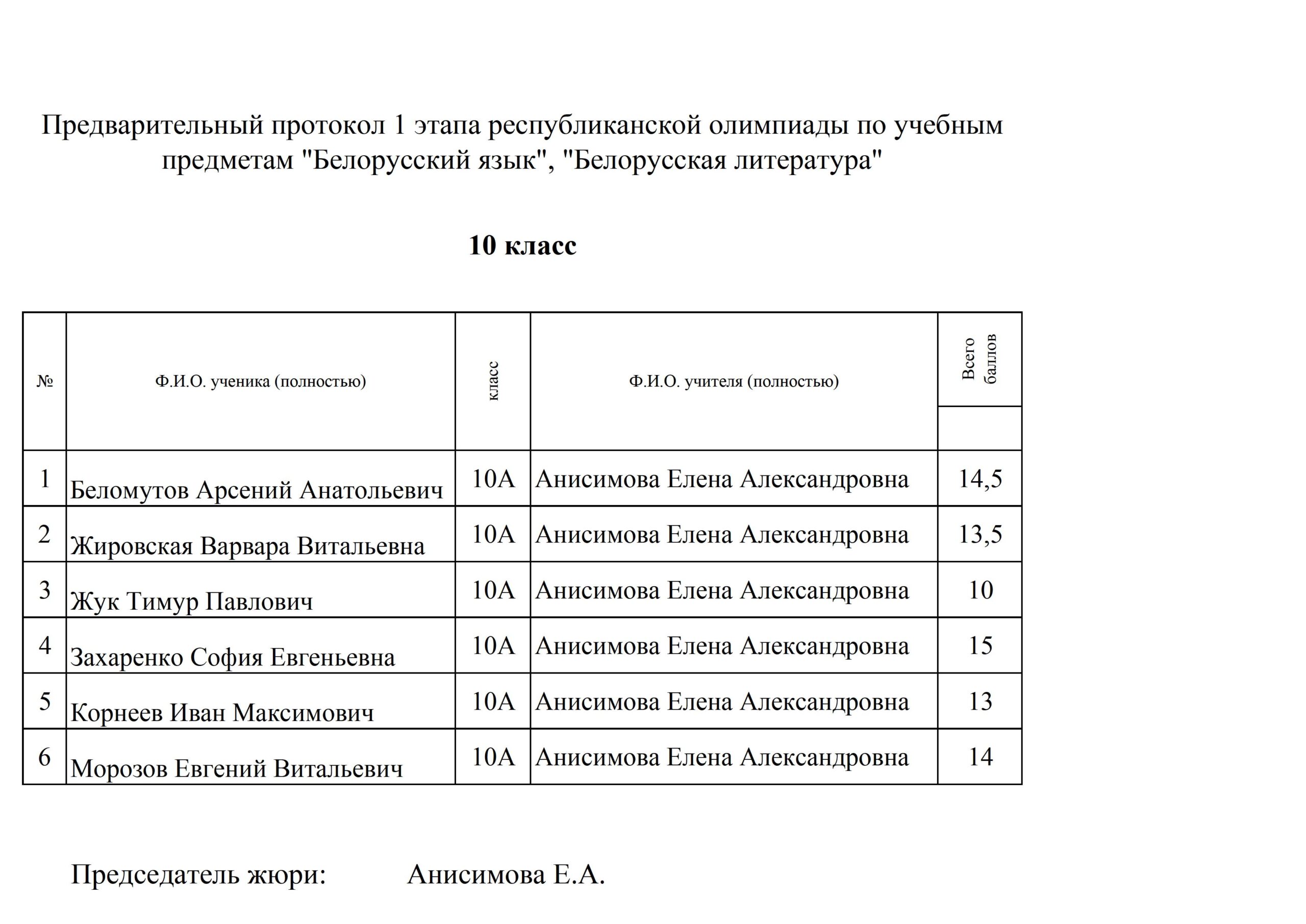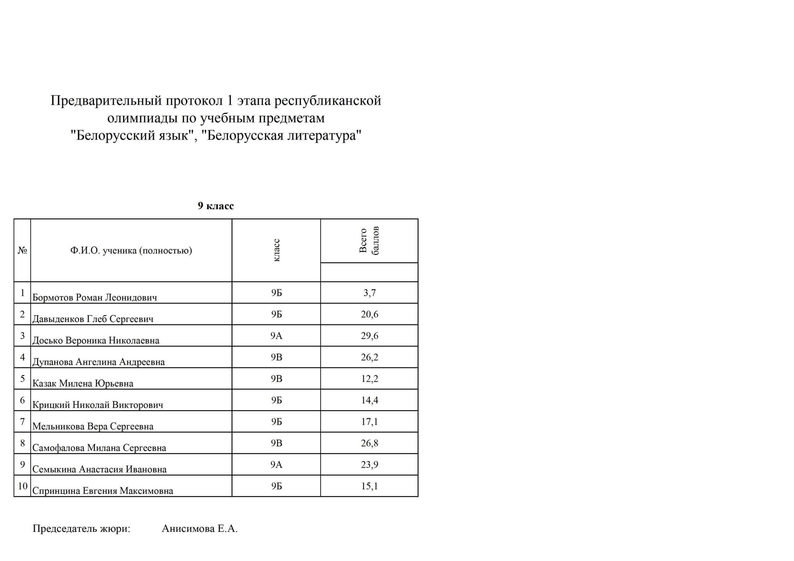 Предварительный протокол первого этапа республиканской олимпиады по учебному предмету Белорусская язык, белорусская литература