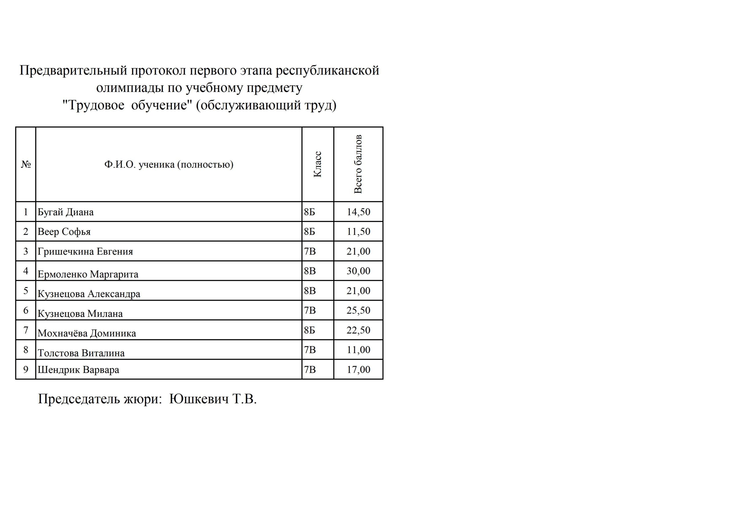 Предварительный протокол первого этапа республиканской олимпиады по учебному предмету Трудовое обучение (обслуживающий труд)
