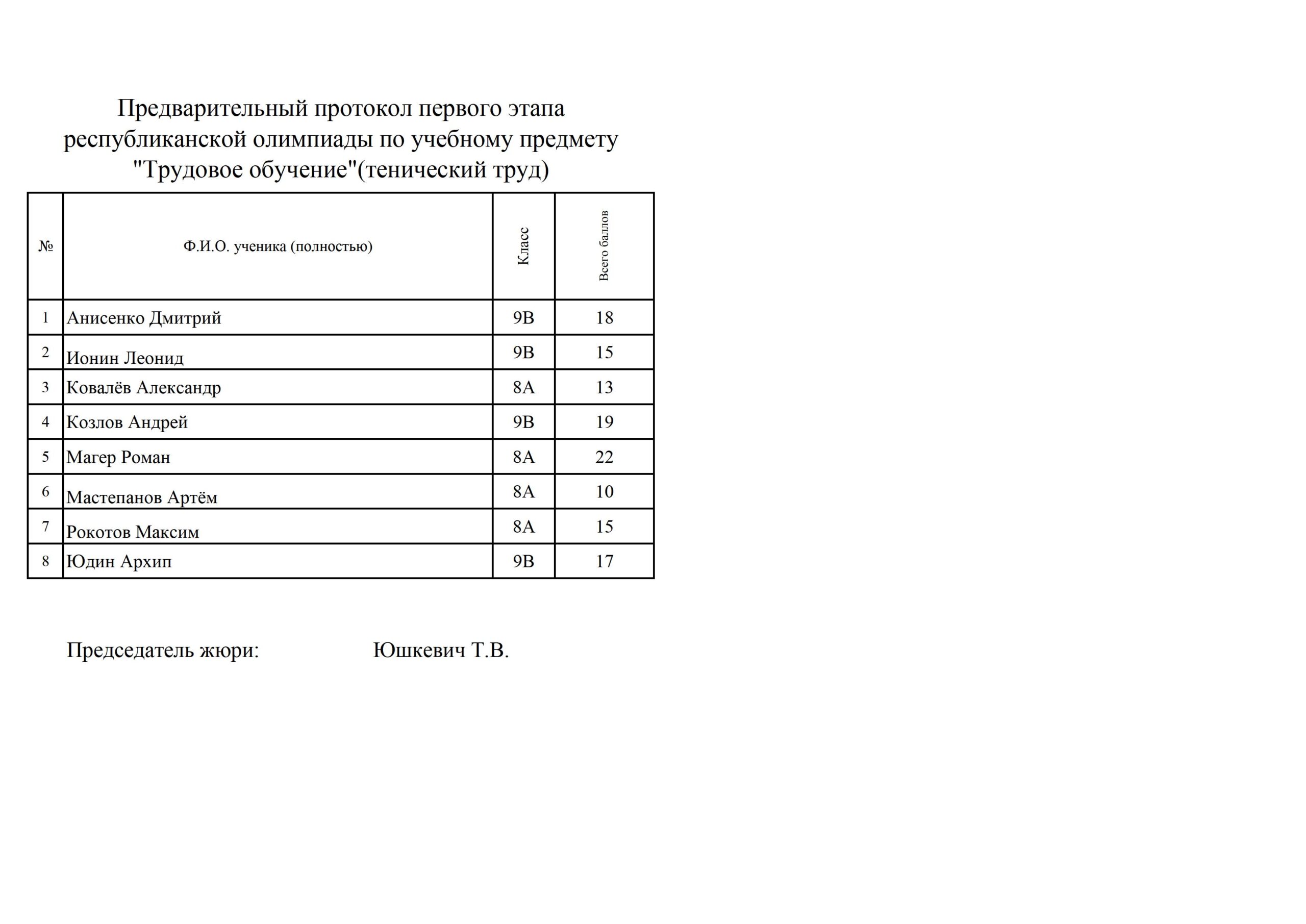 Предварительный протокол первого этапа республиканской олимпиады по учебному предмету Трудовое обучение (технический труд)