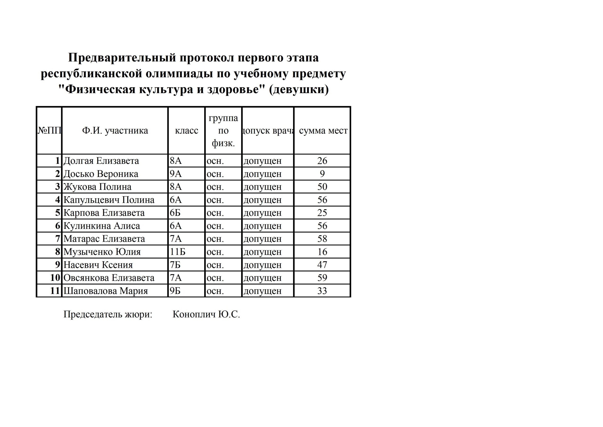Предварительный протокол первого этапа республиканской олимпиады по учебному предмету Физическая культура и здоровье (девушки)